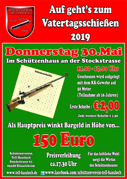 Am 30. Mai findet wieder unser alljährliches Vatertagsschießen statt. Geschossen wird aufgelegt mit Kleinkaliber Gewehr auf Glücksscheiben. Als Hauptpreis winkten 150 Euro.