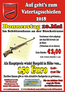 Am 10. Mai findet wieder unser alljährliches Vatertagsschießen statt. Geschossen wird aufgelegt mit Kleinkaliber Gewehr auf Glücksscheiben. Als Hauptpreis winkten 150 Euro.