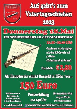 | Vatertagsschießen | Do. 21. Mai | 11-17 Uhr |