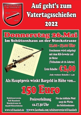 Das Vatertagsschießen in Tell Haßloch findet bereits seit über 50 Jahren in dem Verein statt und ist nach dem Ostereierschießen das zweitgrößte Event. Dabei allerdings das einzige Event, bei dem mit scharfen Waffen geschossen wird. Teilnahme ist somit erst ab 16 Jahren möglich.